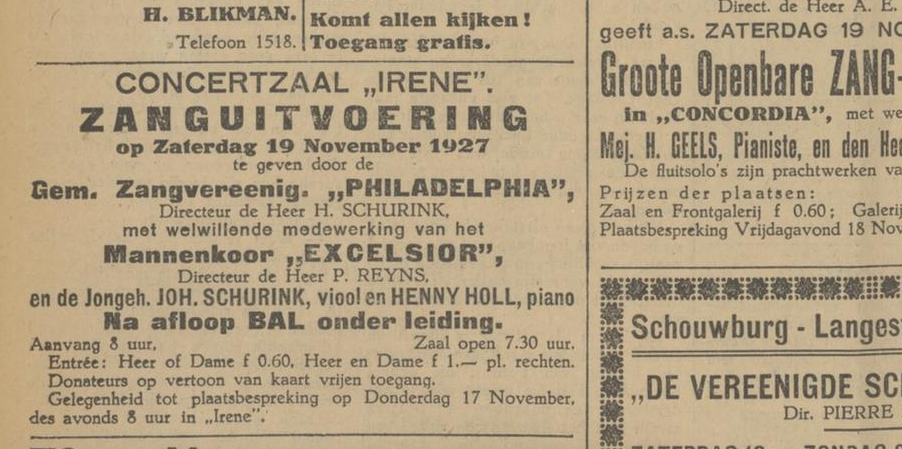 15 november 1927 – Twentsch dagblad Tubantia en Enschedesche courant 23 februari 20213 april 2021 / legêne Concertaankondiging van Zangvereniging Philadelphia in zaal Irene met welwillende medewerking van Excelsior. Home Vind-ik-leuk Aan het laden... Gerelateerd