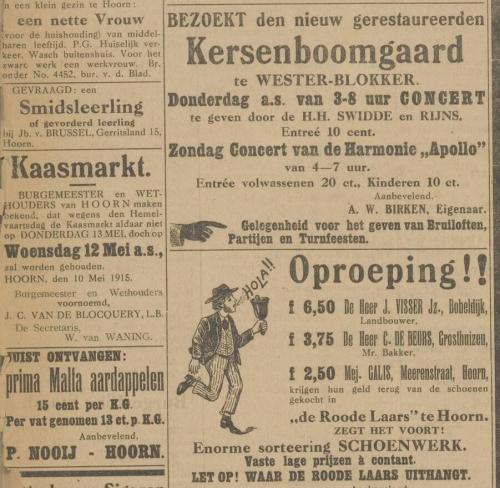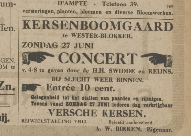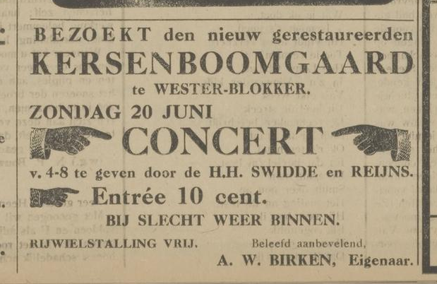 12 mei 1915 – Hoornsche courant 7 maart 202121 maart 2021 / legêne De Kersenboomgaard in West-Blokker is gerestaureerd. Swidde en Reijns gaan er de hele zomer zondagmiddagconcerten geven. Home