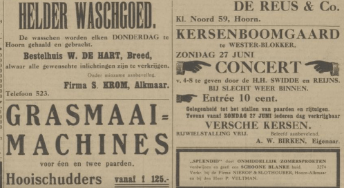 26 juni 1915 – Hoornsche courant 7 maart 202121 maart 2021 / legêne Swidde en Reijns geven een concert in de Kersenboomgaard. Vanaf 27 juni zijn er elke dag verse kersen. Home