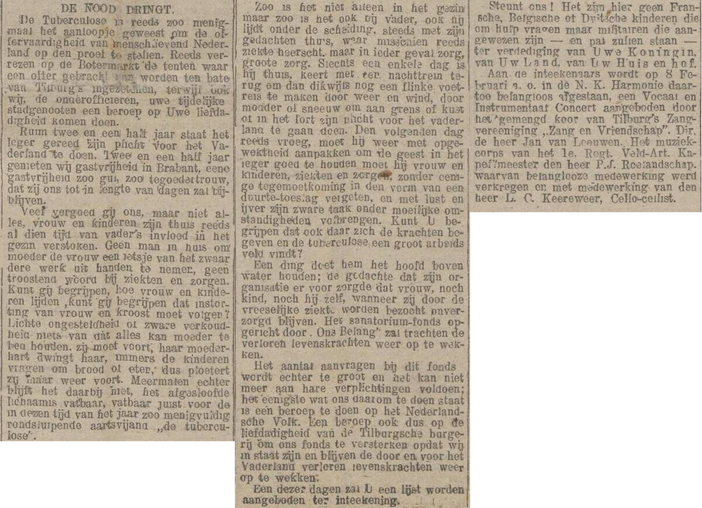 In het hele land werd een beroep gedaan op de vrijgevigheid van burgers, ten behoeve van onderofficieren met tuberculose, en hun gezinnen die daardoor in armoede geraken, en werden benefietconcerten georganiseerd. Hier een voorbeeld uit Tilburg, Tilburgsche courant van 22 januari.