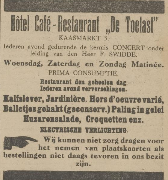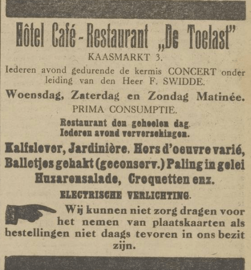 13 augustus 1918 – Hoornsche courant 4 maart 202110 maart 2021 / legêne De Toelast aan de Kaasmarkt pakt flink uit tijdens de kermis. Wel van tevoren bestellen. En onder leiding van Frans Swidde is er elke avond muziek. Home