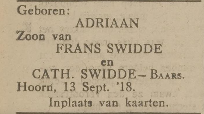 14 september 1918 – Hoornsche courant 4 maart 202110 maart 2021 / legêne Bij Frans Swidde is een zoon geboren, Adriaan. Home