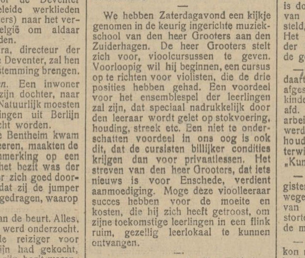 De muziekschool van Reyns was niet de enige plek waar je les kon krijgen. De krant is gaan kijken bij de nieuwe Enschedese vioolschool van de heer Grooters. Leerlingen van Grooters krijgen als leerling van zijn school korting. De krant schrijft dat dit een noviteit is voor Enschede, maar muziekschool Reyns deed dit in 1921 ook al.