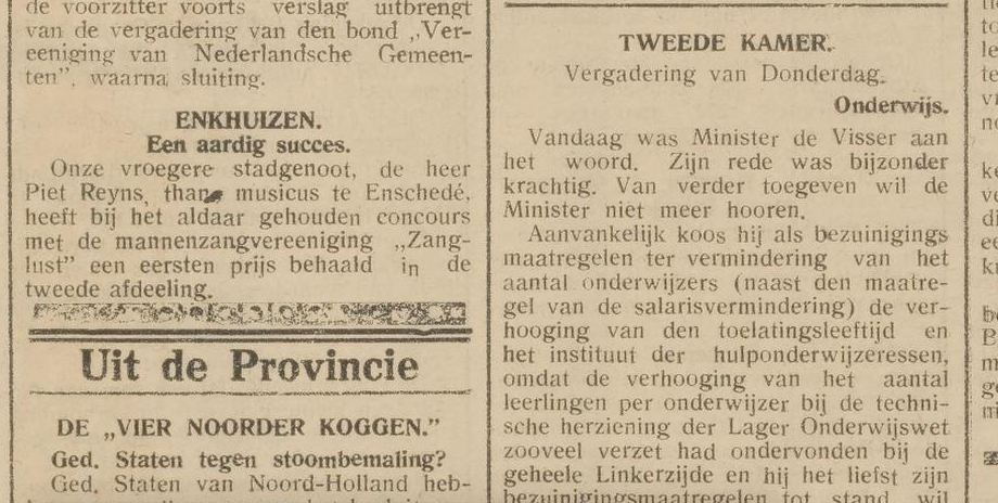 In Hoorn hebben ze gehoord dat hun vroegere stadgenoot Piet Reyns in Enschede met een mannenkoor een prijs heeft behaald bij een concours. Het was alleen niet Zanglust, maar mannenkoor Excelsior.