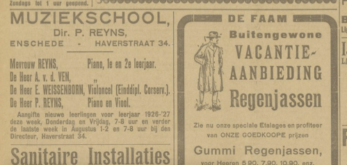 Aan de muziekschool in de Haverstraat is nu een extra pianodocent verbonden, A. van de Ven, en een cellodocent, E. Weissenborn. Het gaat hier om Erich Ernst Weissenborn, kleinzoon van de Duits-Nederlandse componist Ernst Wettig-Weissenborn.