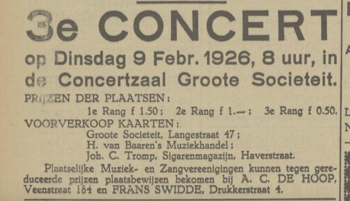 Aan de muziekschool in de Haverstraat is nu een extra pianodocent verbonden, A. van de Ven, en een cellodocent, E. Weissenborn. Het gaat hier om Erich Ernst Weissenborn, kleinzoon van de Duits-Nederlandse componist Ernst Wettig-Weissenborn.