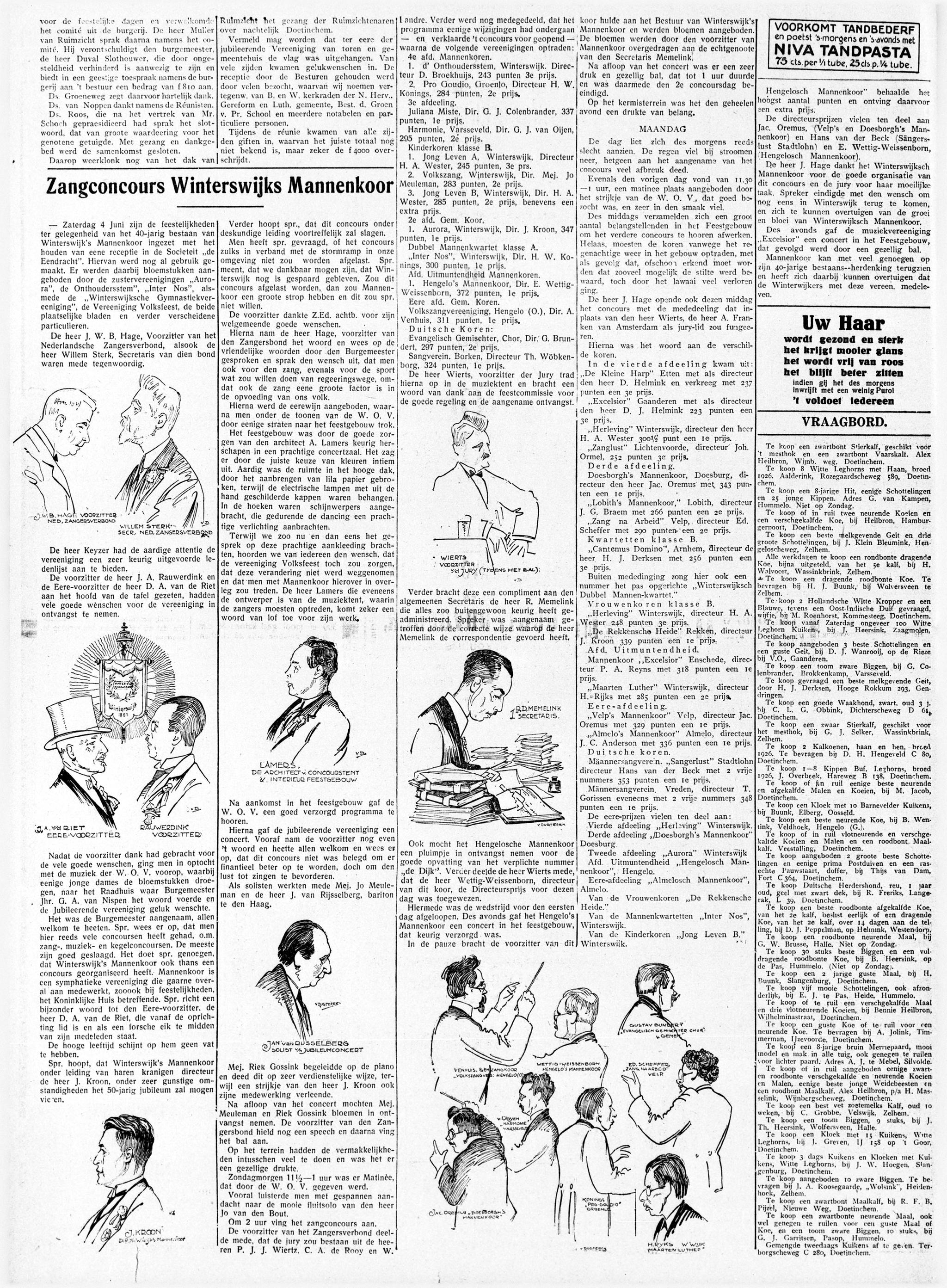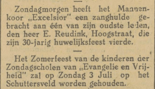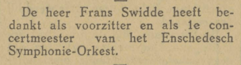 De Enschedesche Burger Harmonie, directeur B. de Bruin, bestaat 30 jaar. Dat is niet zo bijzonder, maar “in deze tijd van normalisatie en vervlakking dient geen poging onbeproefd te worden gelaten om corpsen welke op kloeke wijze voortgaan den kunst te dienen en hierbij de publieke belangstelling, welke zich helaas begint te oriënteren in een richting van veel lager plan, dreigen te verliezen, van tijd tot tijd een ruggesteun te geven, teneinde deze in staat te stellen den vaak moeilijken strijd om het bestaan te blijven voeren.”
