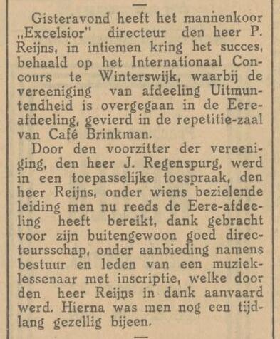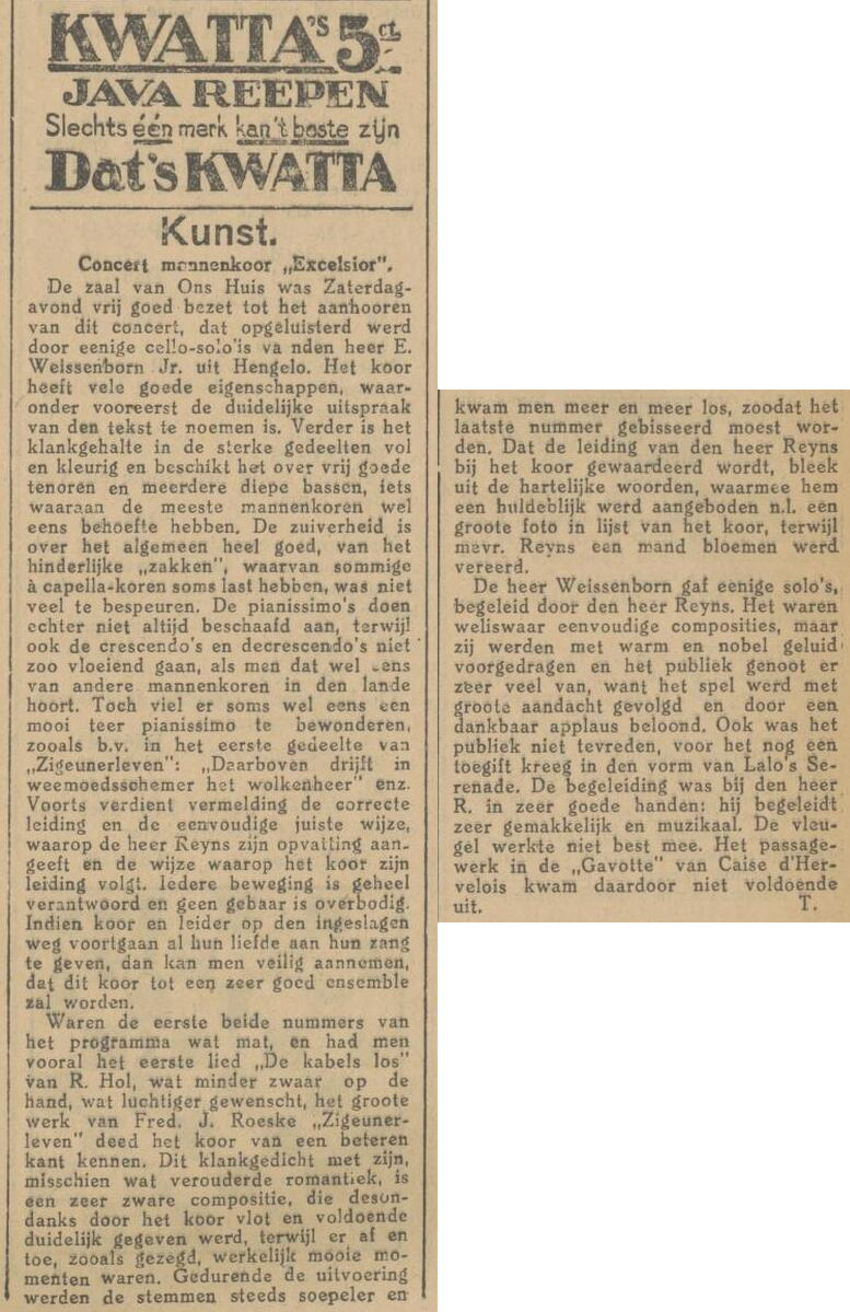 Een lovende kritiek van het winterconcert van Excelsior. Het koor blijft mooi op toon en bij het dirigeren is geen gebaar overbodig. De dirigent krijgt als bedank een ingelijste foto van het koor en mevrouw Reijns een mand bloemen.