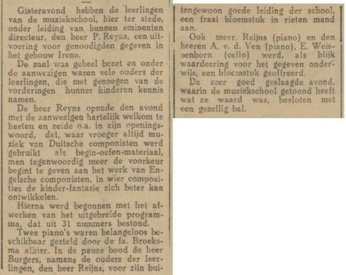 De celloleraar van de muziekschool, Ernst Weissenborn, speelt ook en Reyns begeleidt hem. “De heer Reyns begeleidt zeer gemakkelijk en muzikaal.” Jammer alleen dat de vleugel niet best meewerkte.