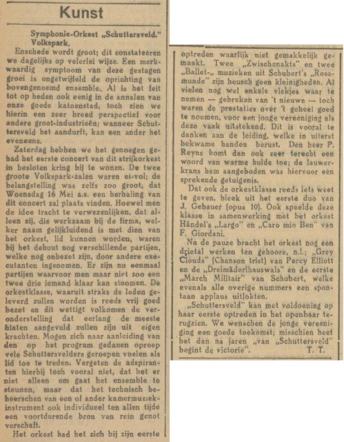 Textielfabriek Schuttersveld heeft een orkest en een leerlingenorkest opgericht en geeft een eerste concert in het Volkspark. Dirigent is Reyns. Het orkest wordt nu nog aangevuld met musici van buiten de fabriek. Maar er zullen vast meer Schuttersvelders mee gaan doen, immers “het technisch beheersen van een of ander kamermuziekinstrument verschaft te allen tijde een voortdurende bron van rein genot”.