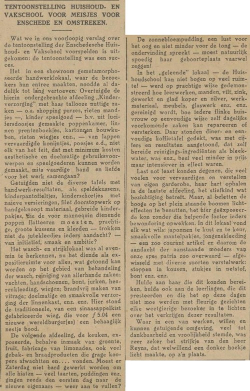 De Enschedese huishoud- en vakschool houdt een tentoonstelling met demonstraties van ambachten. Reyns verzorgt de achtergrondmuziek.