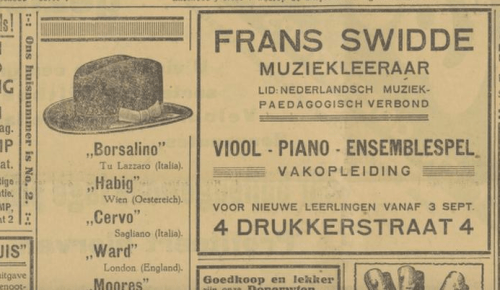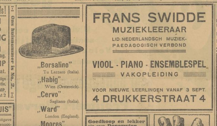 Muziekschool Frans Swidde heeft intussen ook niet stilgezeten. Je kunt bij hem terecht voor viool, piano en ensemblespel en voor de vakopleiding. Swidde is aangesloten bij het Nederlands Muziekpedagogisch Verbond, dat is voortgekomen uit de Vereniging voor muziekonderwijzers en -onderwijzeressen. Leo Samama en Hylke van Lingen hebben in ‘Nederlandse muziek in de 20-ste eeuw: voorspel tot een nieuwe dag‘ de pogingen tot organisatievormen van de toonkunstwereld beschreven (blz. 106, 107, 108).