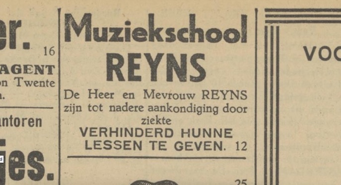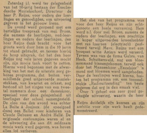 De muziekschool bestaat 10 jaar. Het wordt gevierd in zaal Irene. Er is een dameskoor samengesteld, het ballet La boîte à Joujoux van Debussy/Hellé (uit 1913) wordt opgevoerd en het is een prachtige avond. Reyns krijgt een koperen kroonluchter (elektrisch) en mevrouw Reyns witte anjers. De leerlingen voeren ook nog een toneelstukje op.