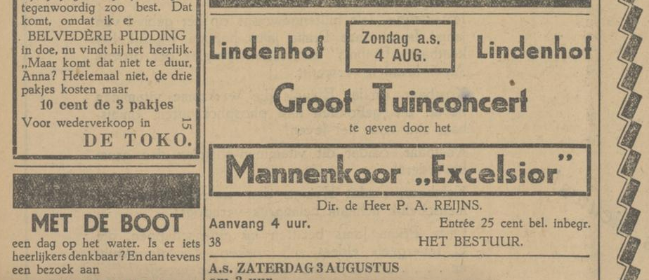31 juli 1929 – Twentsch dagblad Tubantia en Enschedesche courant 21 februari 202130 april 2021 / legêne Excelsior geeft een tuinconcert op het Lindenhof. Het programma wordt in de krant gezet.