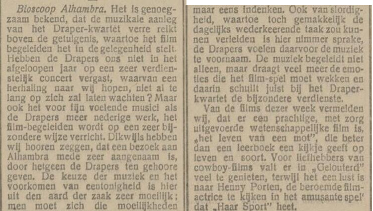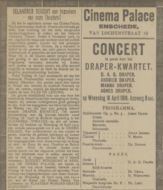 In 1919 kondigt de directie van bioscoop Alhambra in Enschede in een paginagrote advertentie aan dat ze ook Cinema Palace gaan exploiteren en dat het Draper Kwartet gecontracteerd is om de film te begeleiden. Om het publiek kennis te laten maken, geeft het Draper Kwartet een concert. Ook is de advertentie in de krant voorzien van perskritieken uit landelijke dagbladen.