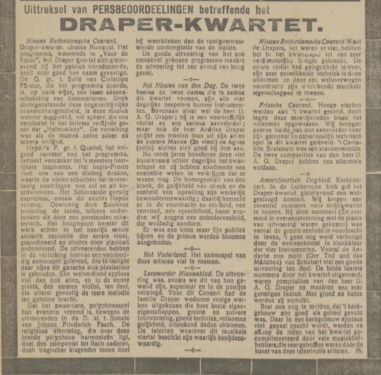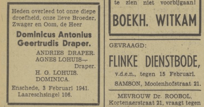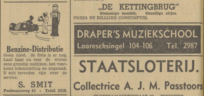 Draper’s muziekschool adverteerde tot in het eerste oorlogsjaar. De muziekschool moet in die ±20 jaar behoorlijk zijn uitgebreid. Begonnen in de Drukkerstraat 3, is hij nu gevestigd in een dubbel pand aan de Laareschsingel. Hier de laatste advertentie, van 21 september 1940: