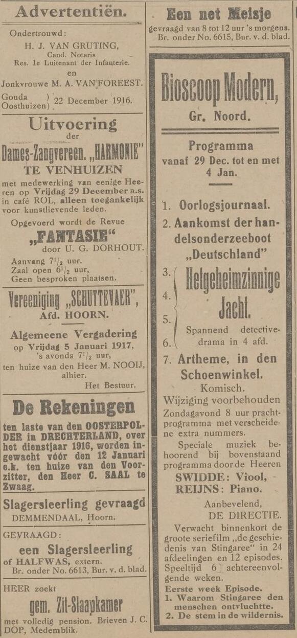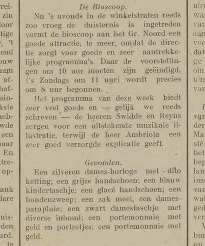 In de krant wordt aangekondigd dat de bioscoop aan het Groote Noord aan haar inrichting verbonden heeft de heren Swidde en Reijns (met y), die het aantrekkelijke van de voorstellingen gaan verhogen.