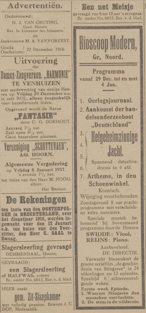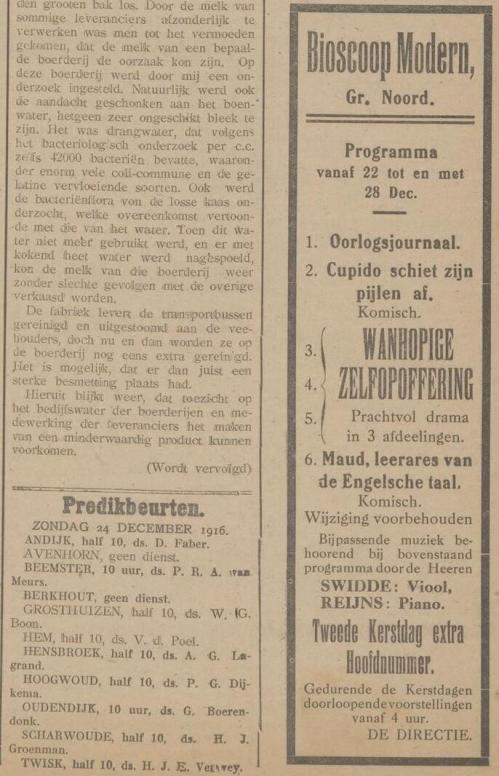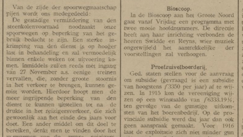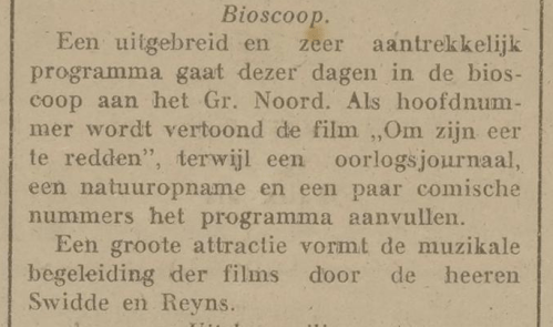 In de krant wordt aangekondigd dat de bioscoop aan het Groote Noord aan haar inrichting verbonden heeft de heren Swidde en Reijns (met y), die het aantrekkelijke van de voorstellingen gaan verhogen.