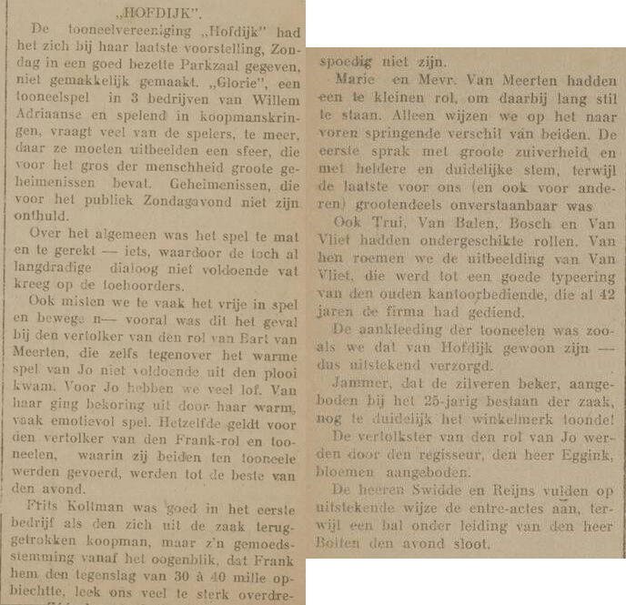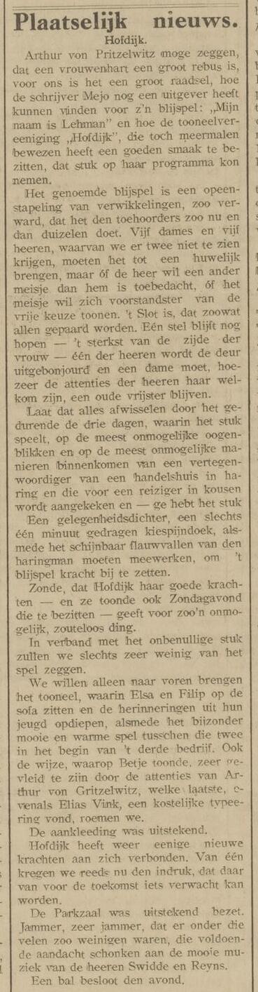 Swidde en Reijns (gespeld als Reyns) begeleiden in De Parkzaal een blijspel van toneelvereniging Hofdijk. De recensent betreurt het dat er maar weinig mensen waren die voldoende aandacht schonken aan de mooie muziek.